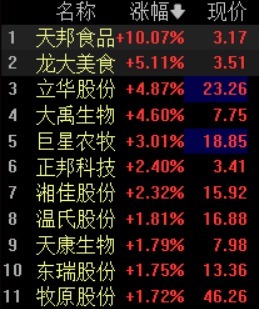 早盘,猪肉概念表现活跃,天邦食品直线涨停,龙大美食、大禹生物、立华股份、天康生物、正邦科技跟涨。