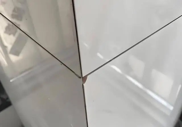 合格的海棠角长什么样?缝隙1.5到2毫米。倒角留2到3毫米厚,不能切透。用手摸边缘不扎手。用手电筒照,看不到大面积瓷砖胚体颜色。