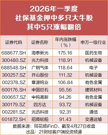 截至4月27日收盘,社保基金一季度持有的多只绩优股年内涨幅已翻倍。其中,海泰新光(688677.SH)居涨幅榜首,年内累计涨幅超175%,4月累计涨幅已超117%。