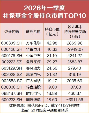 随着A股2026年一季报披露临近尾声,社保基金一季末重仓股及调仓情况也浮出水面。