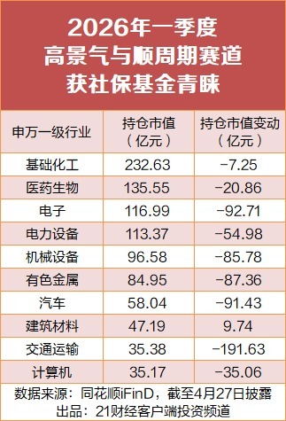 同花顺iFind数据显示,截至4月27日披露,社保基金对基础化工、机械设备、电子、医药生物和电力设备行业的持股数量最多;持仓市值方面,社保基金对基础化工行业持仓市值超232.62亿元,居行业持仓市值之首;对医药生物行业持仓超135.55亿元;对电子行业持仓市值近117亿元。