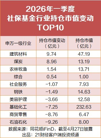 值得注意的是,社保基金持仓市值变动中,建筑材料、煤炭、农林牧渔三大传统行业变动最大,分别增加9.74亿元、8.96亿元和1.54亿元,持仓市值分别为47.19亿元、13.19亿元、13.71亿元。